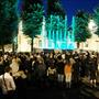 fontana luminosa danzante di Viorica. E sullo sfondo la biblioteca Calvo e il